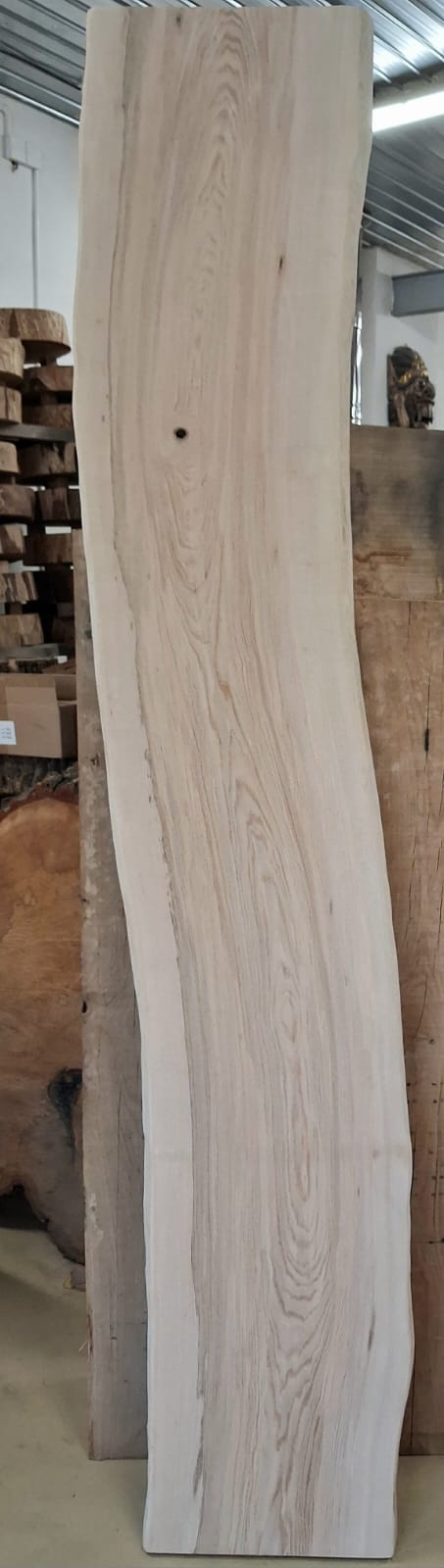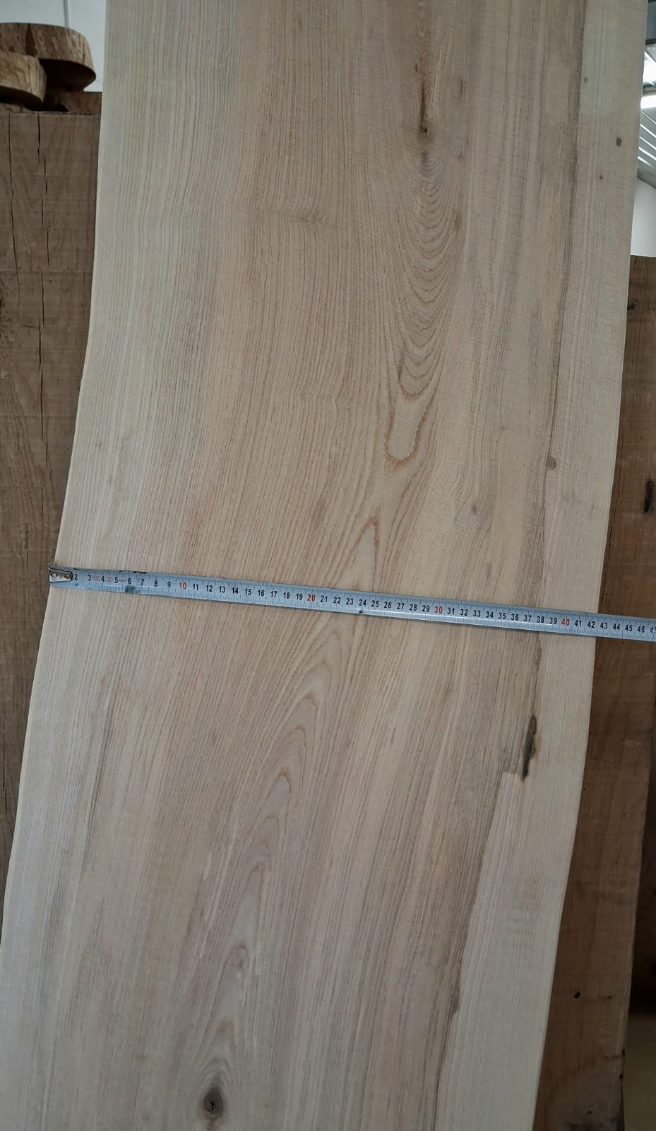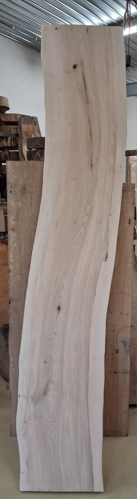Fošna z jasanu suchá, obroušená. Masivní fošna s přírodními hranami připravená na další využití.