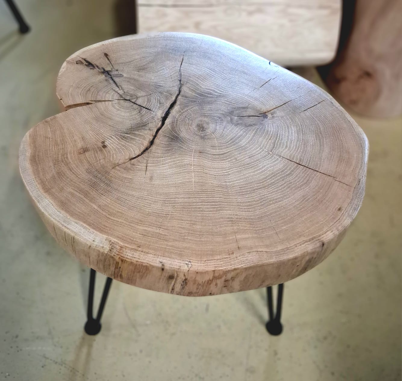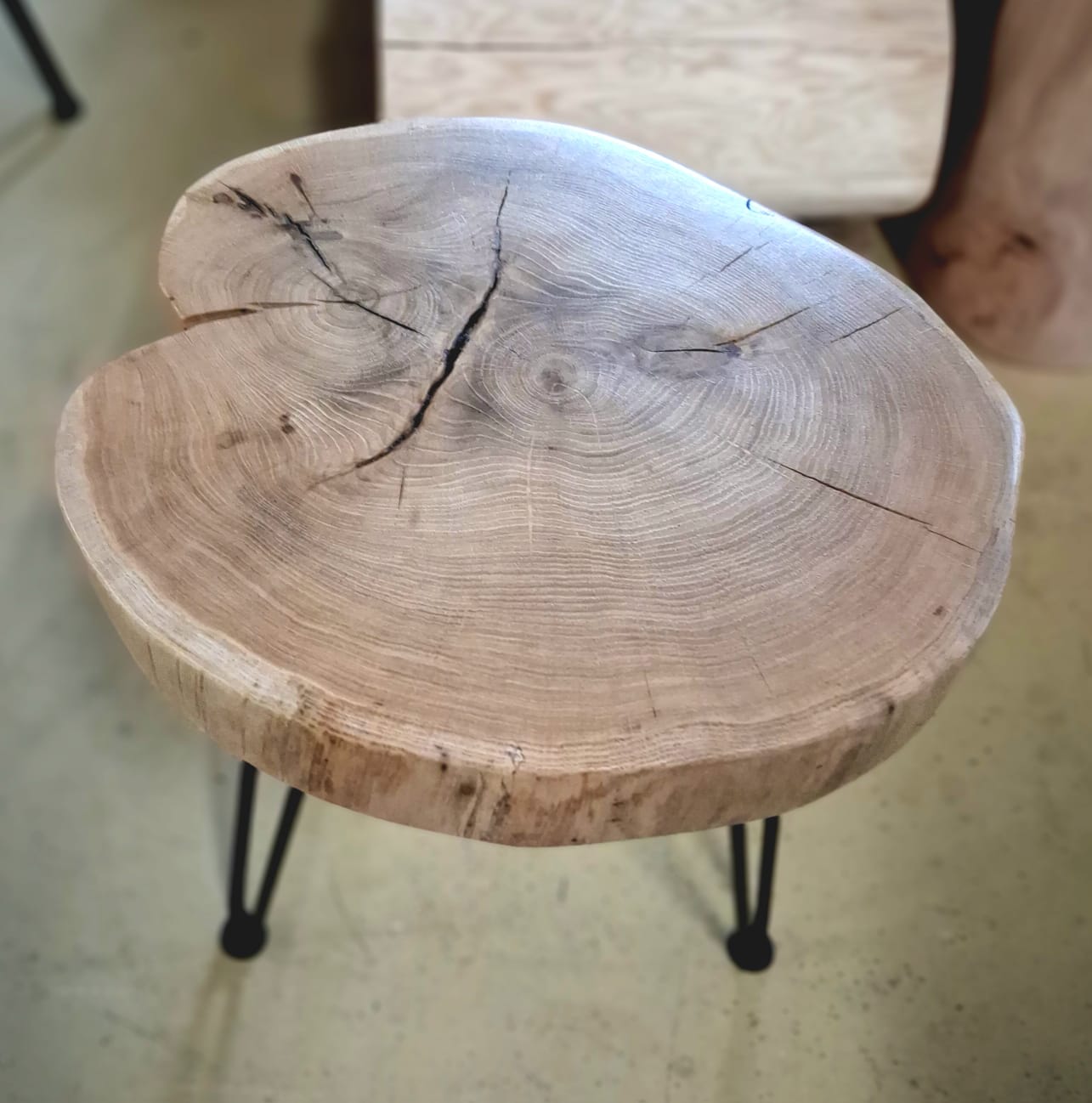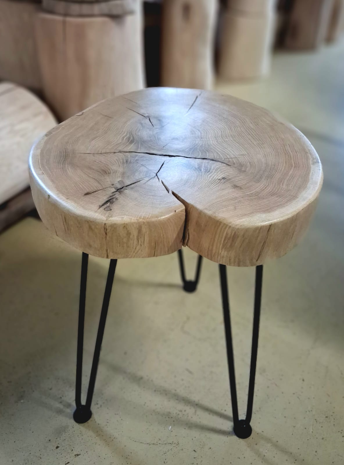 Elegantní a poctivý kousek přírody. Tento stolek je vyrobený z masivního dubu zimního a zpracován formou příčného řezu, díky kterému vyniká kresba letokruhů i přirozený tvar stromu. Povrch je ručně broušený a je chráněn ekologickým nátěrem, který zvýrazňuje barvu i strukturu dřeva.