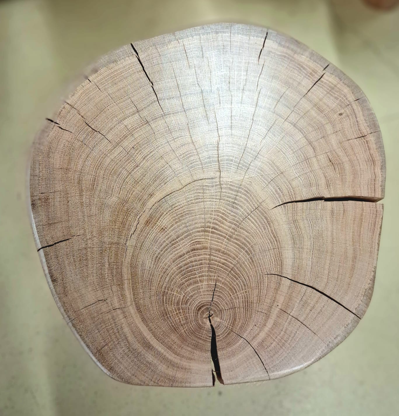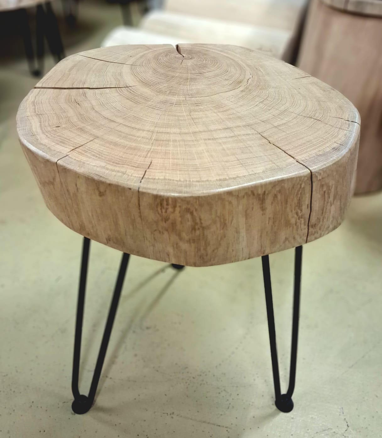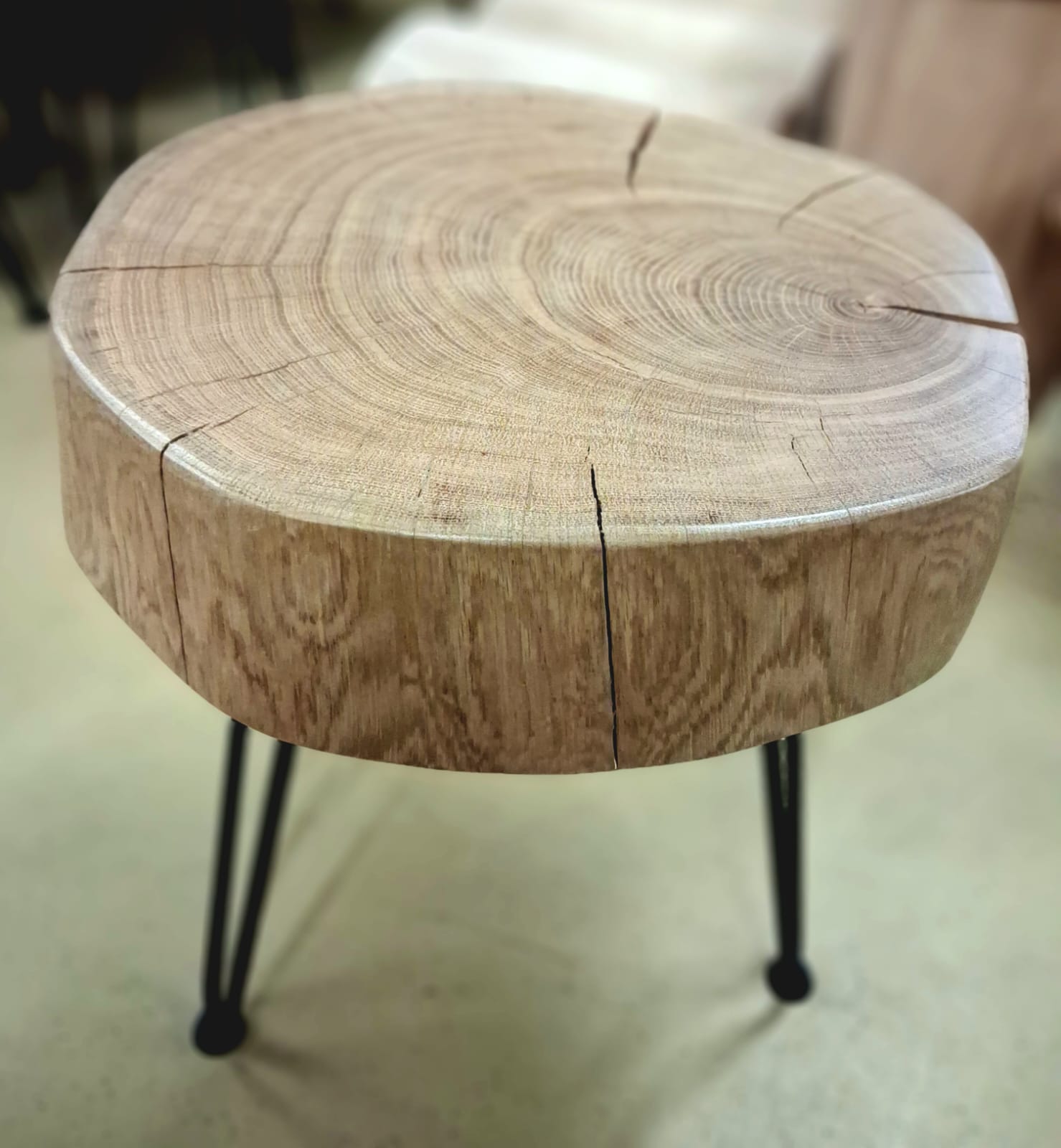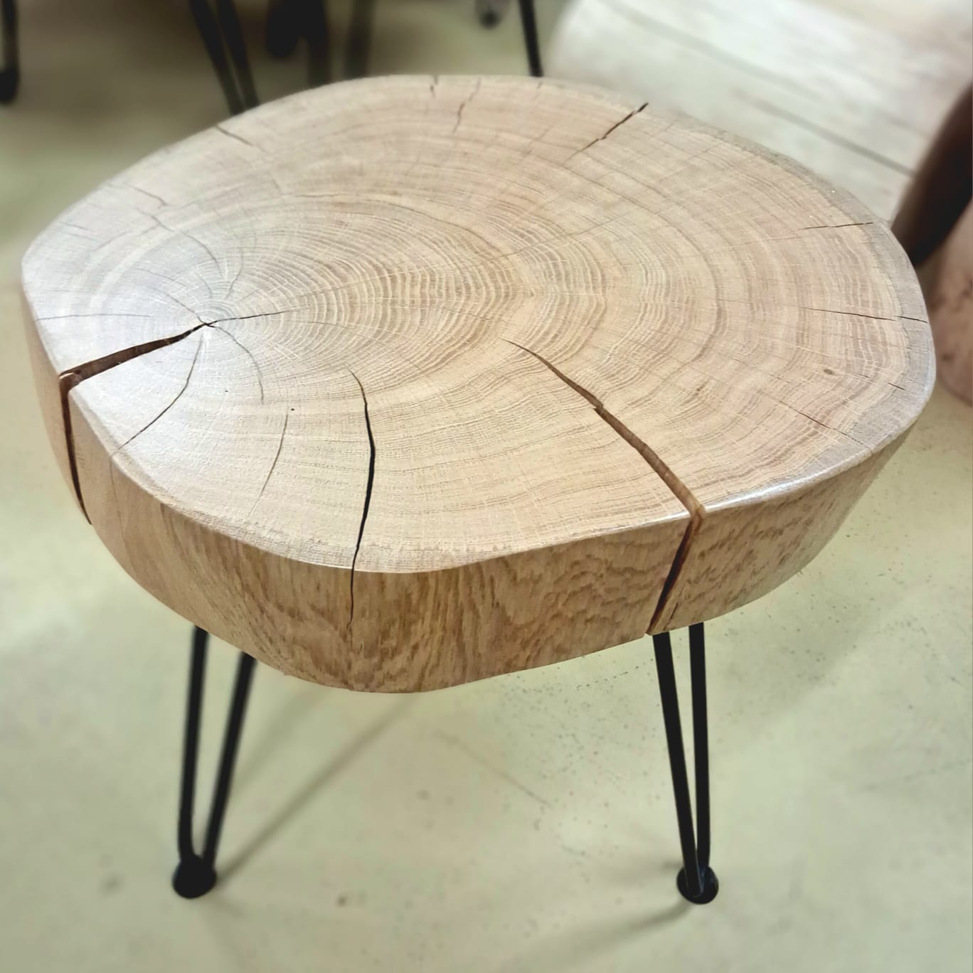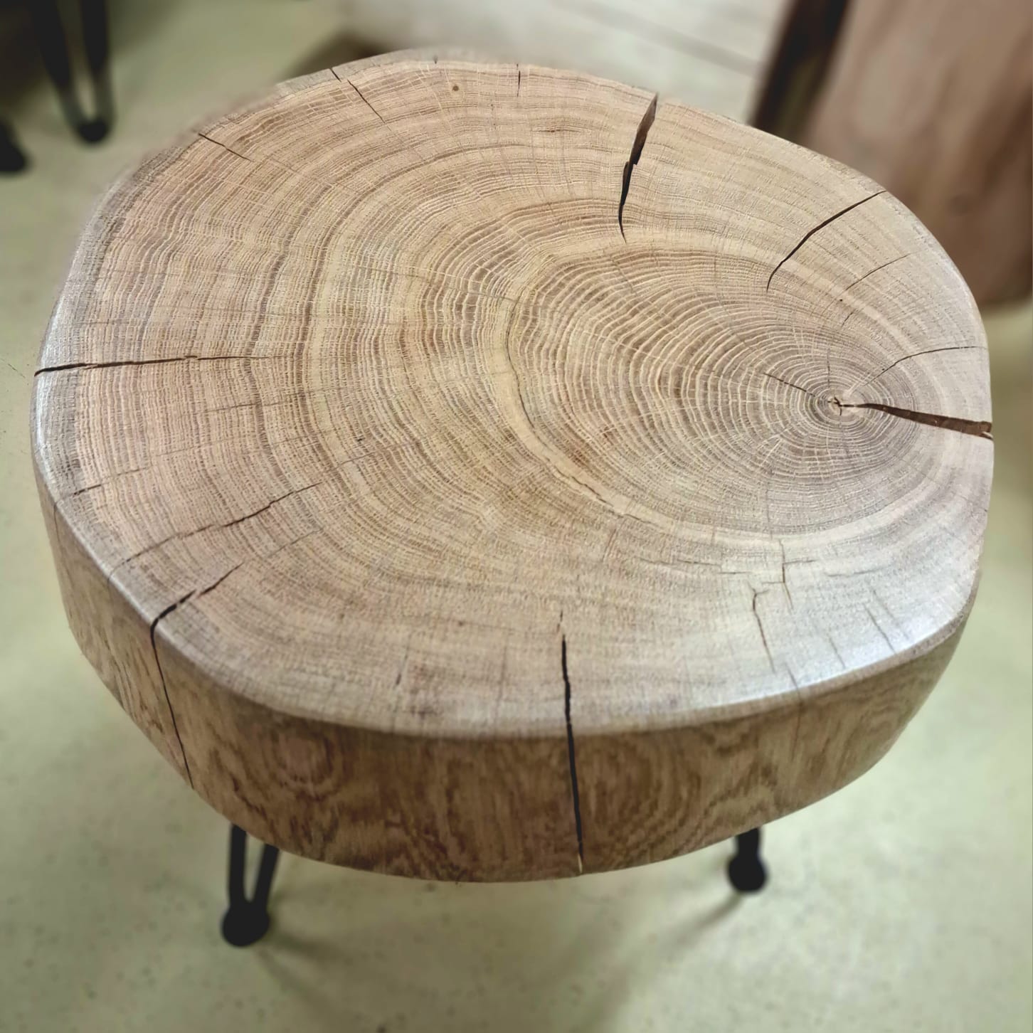 Elegantní a poctivý kousek přírody. Tento stolek je vyrobený z masivního dubu zimního a zpracován formou příčného řezu, díky kterému vyniká kresba letokruhů i přirozený tvar stromu. Povrch je ručně broušený a je chráněn ekologickým nátěrem, který zvýrazňuje barvu i strukturu dřeva.