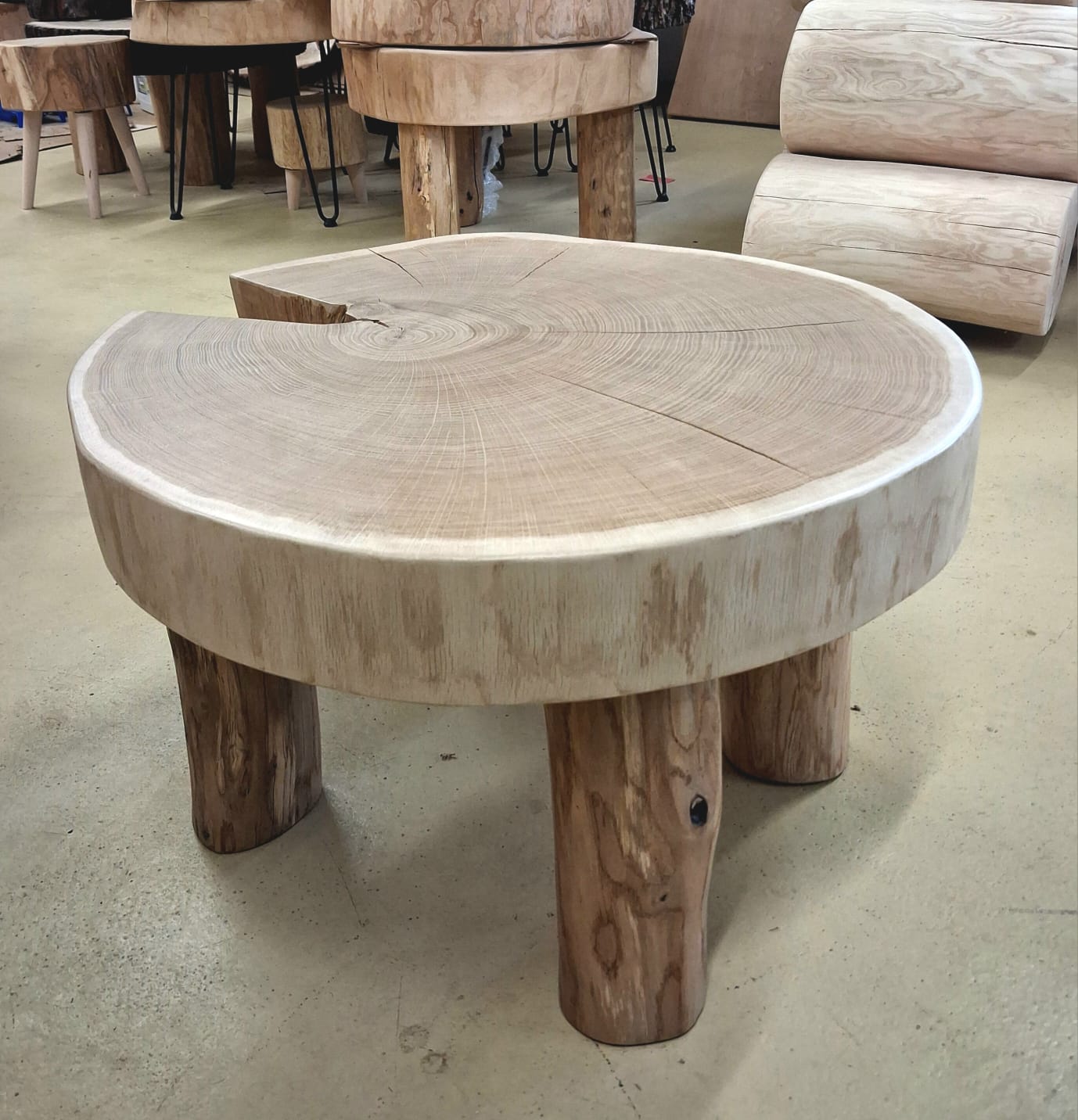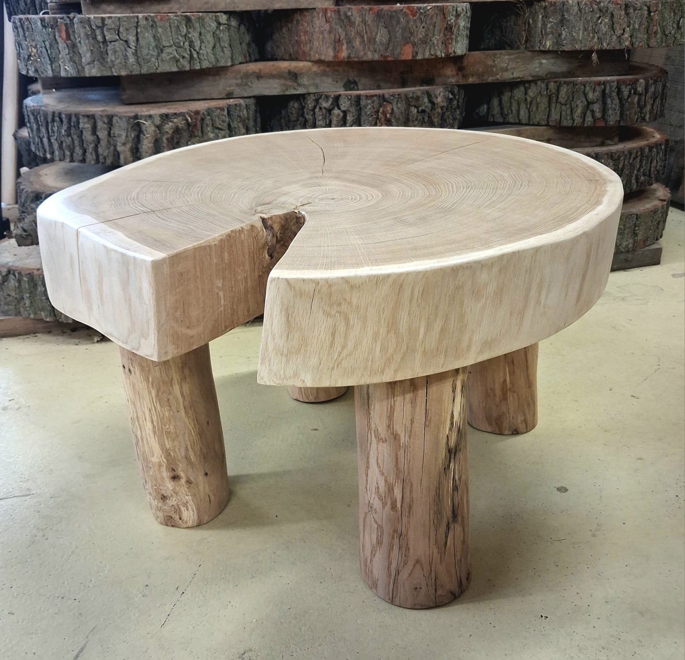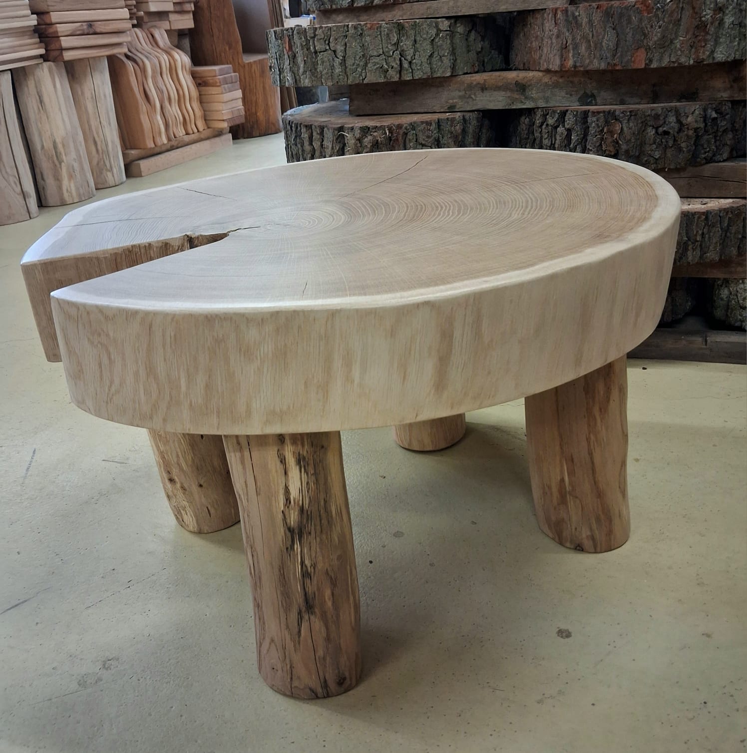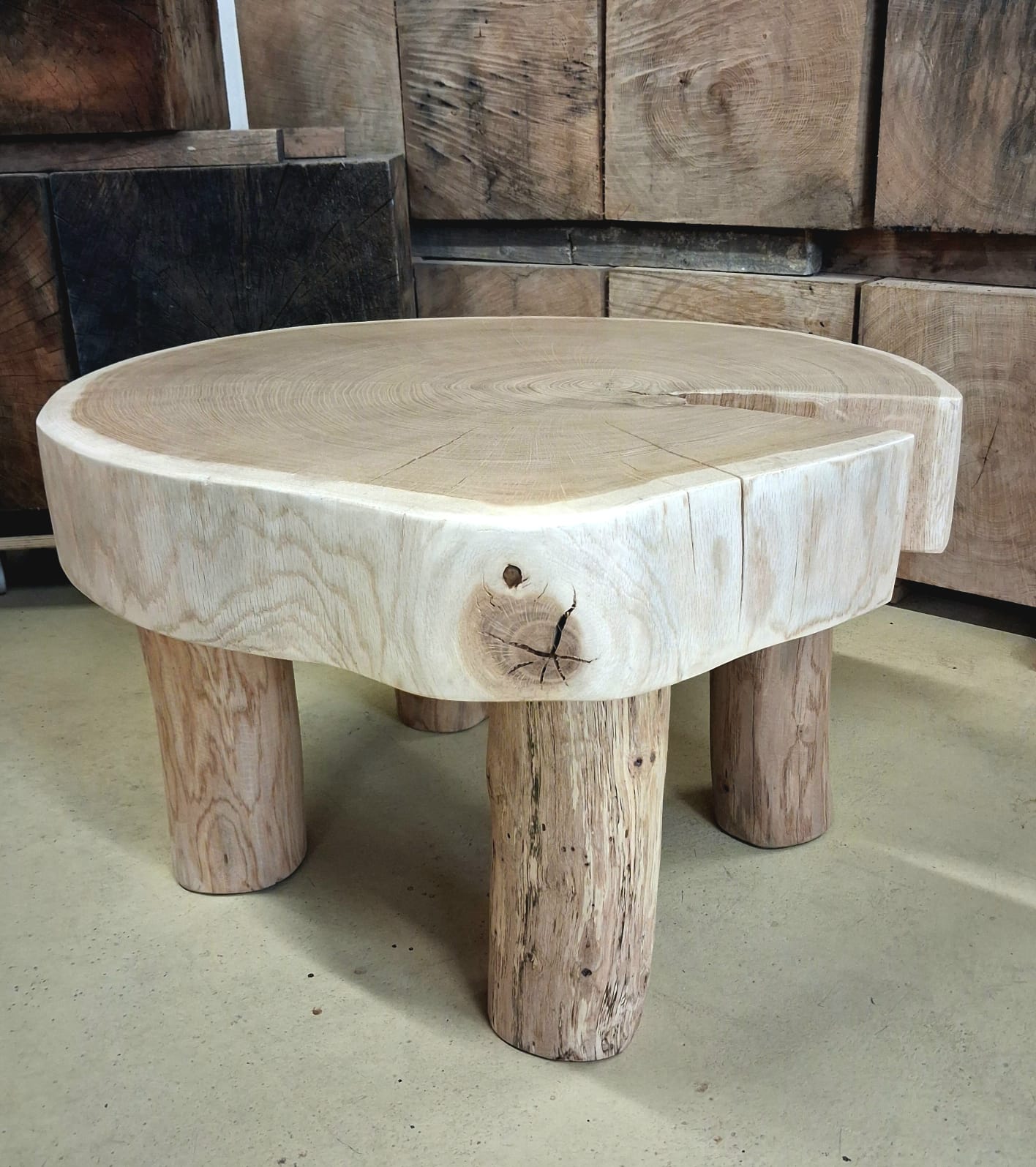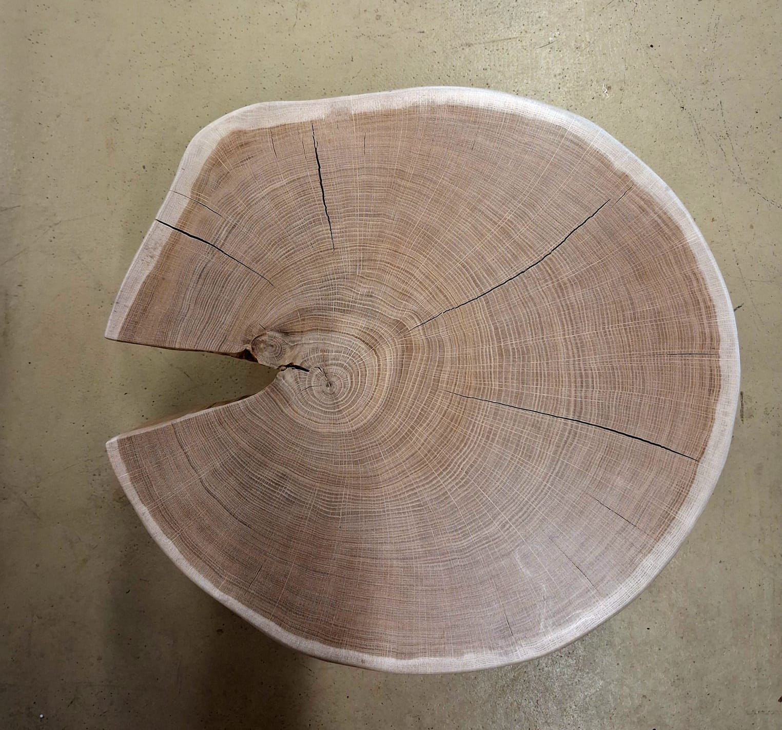 Stolek vyrobený z masivního dubového koláče. Jedná se o klasický příčný řez dubem letním. Hladce broušený koláč je umístěný na stabilních ručně opracovaných dřevěných podnožích.