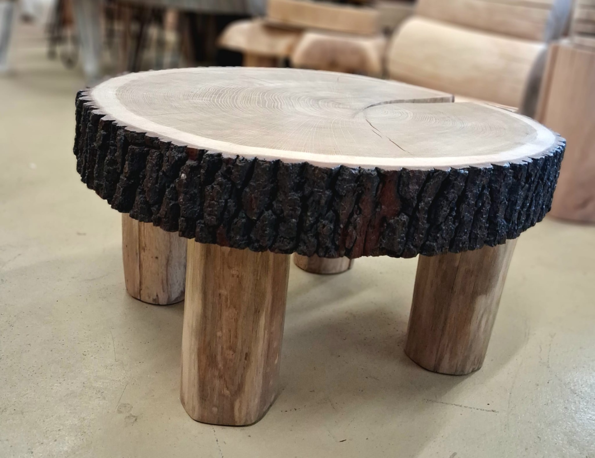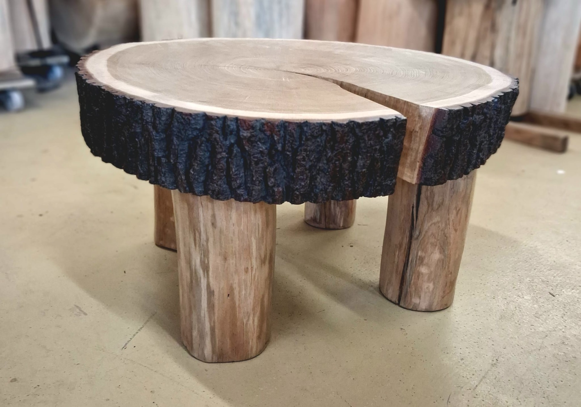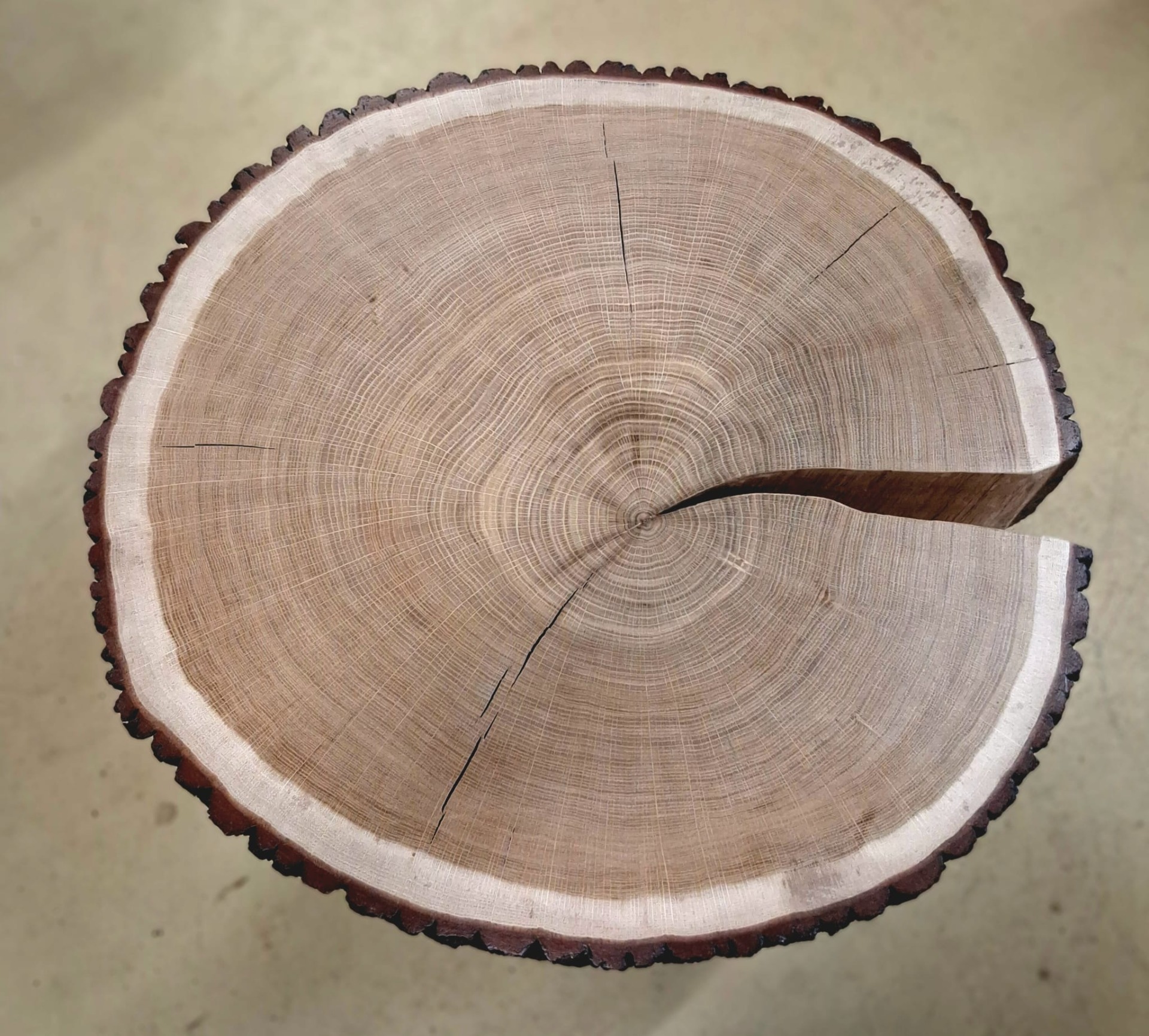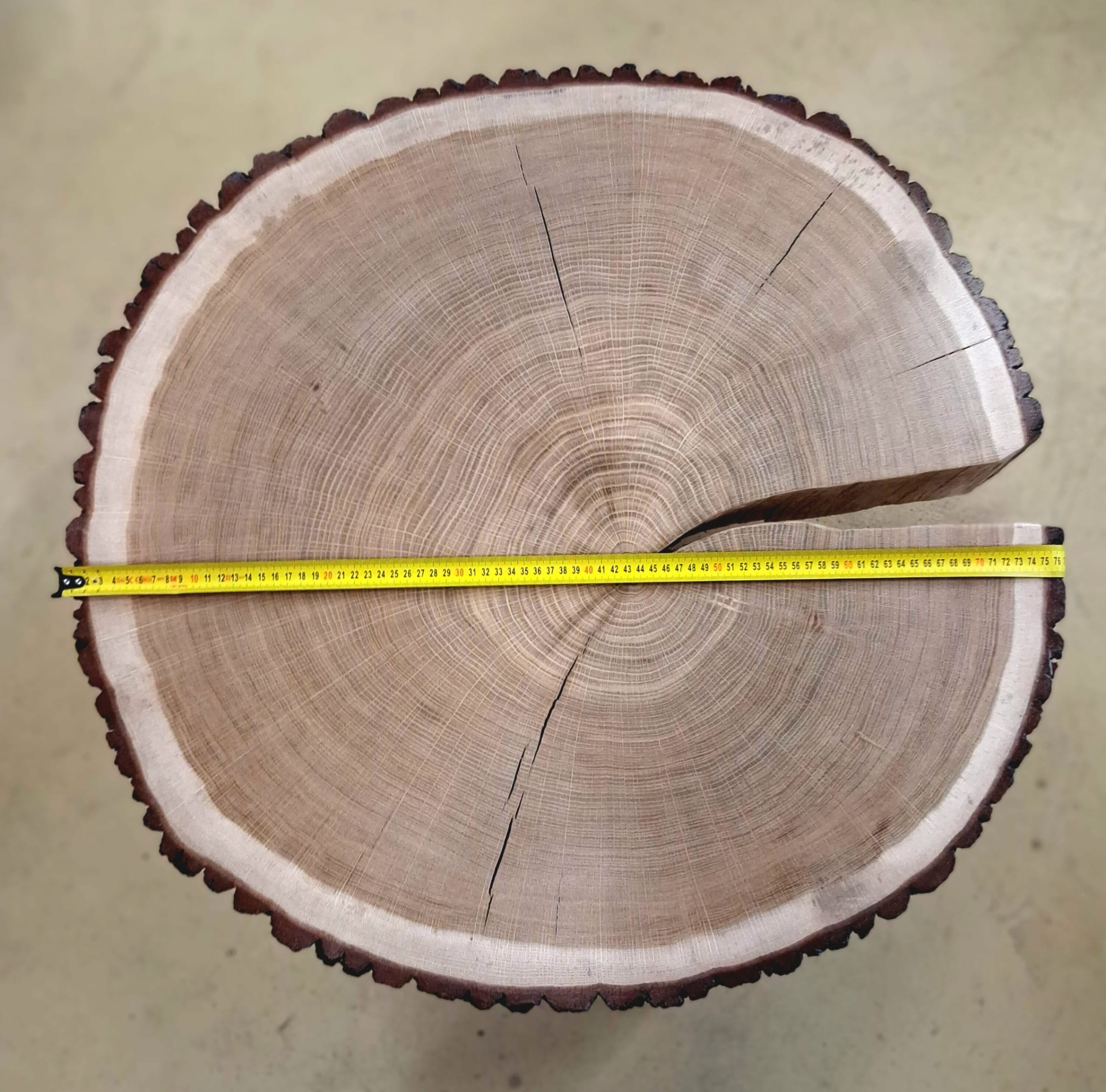 Stolek vyrobený z masivního dubového koláče. Jedná se o klasický příčný řez dubem letním. Hladce broušený koláč je umístěný na stabilních ručně opracovaných dřevěných podnožích.