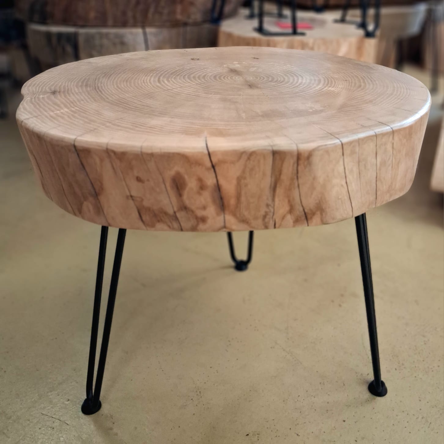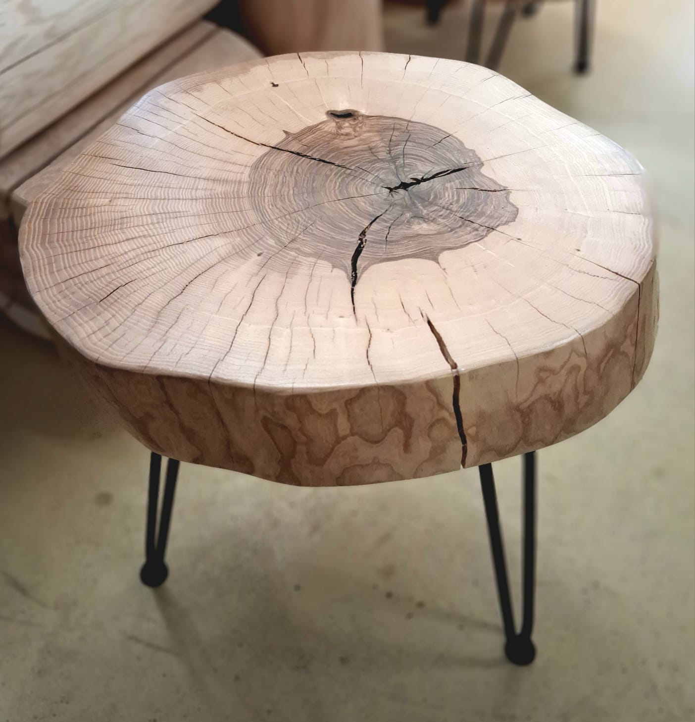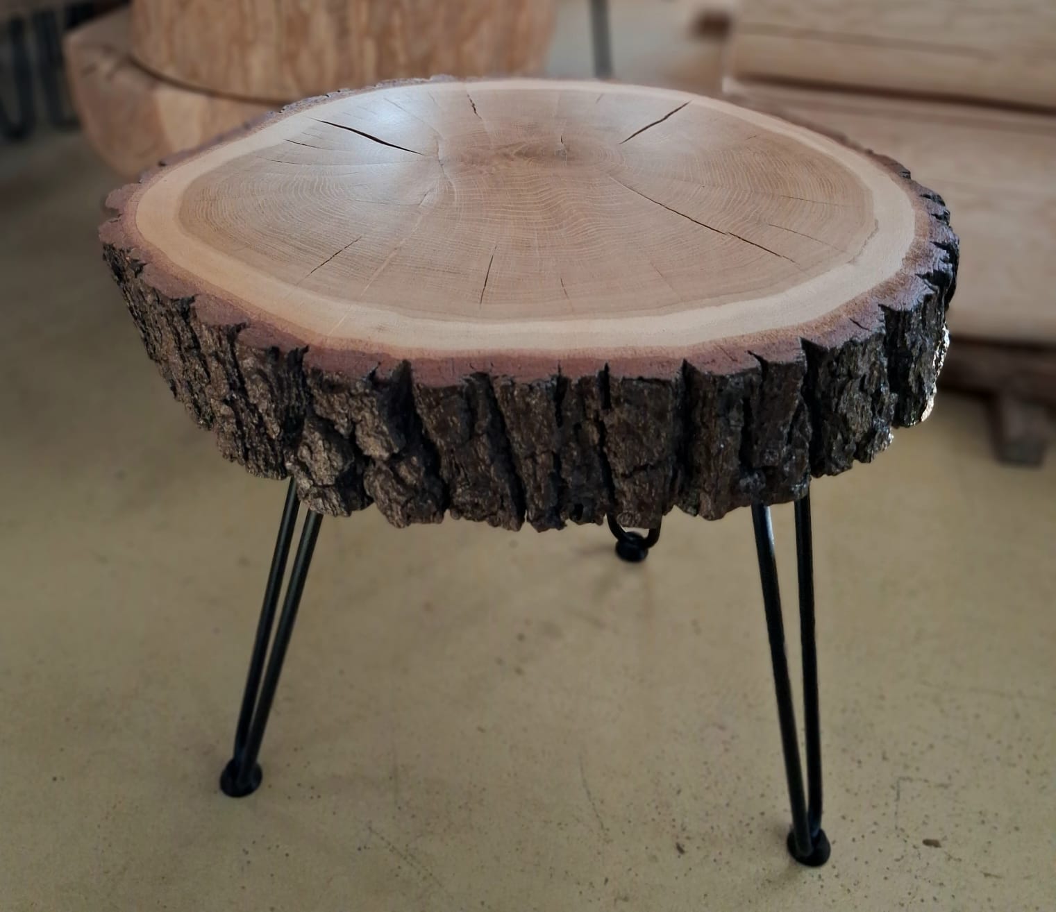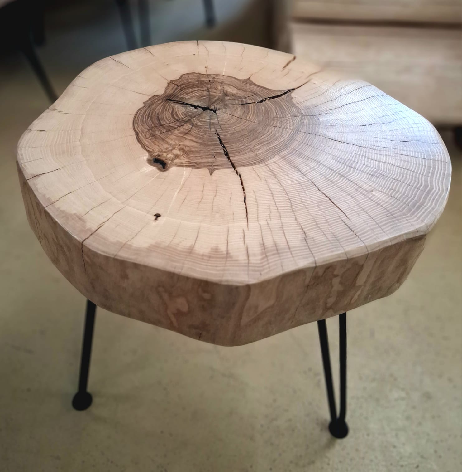Stolek vyrobený z vybraného jasanového dřeva. Jedná se o příčný řez českým jasanem ztepilým. Jedinečný ručně broušený koláč je ponechaný v původním přírodním tvaru stromu. Dřevo je pečlivě ošetřené ekologickým ochranným nátěrem pro dlouhou životnost a zvýraznění kresby.