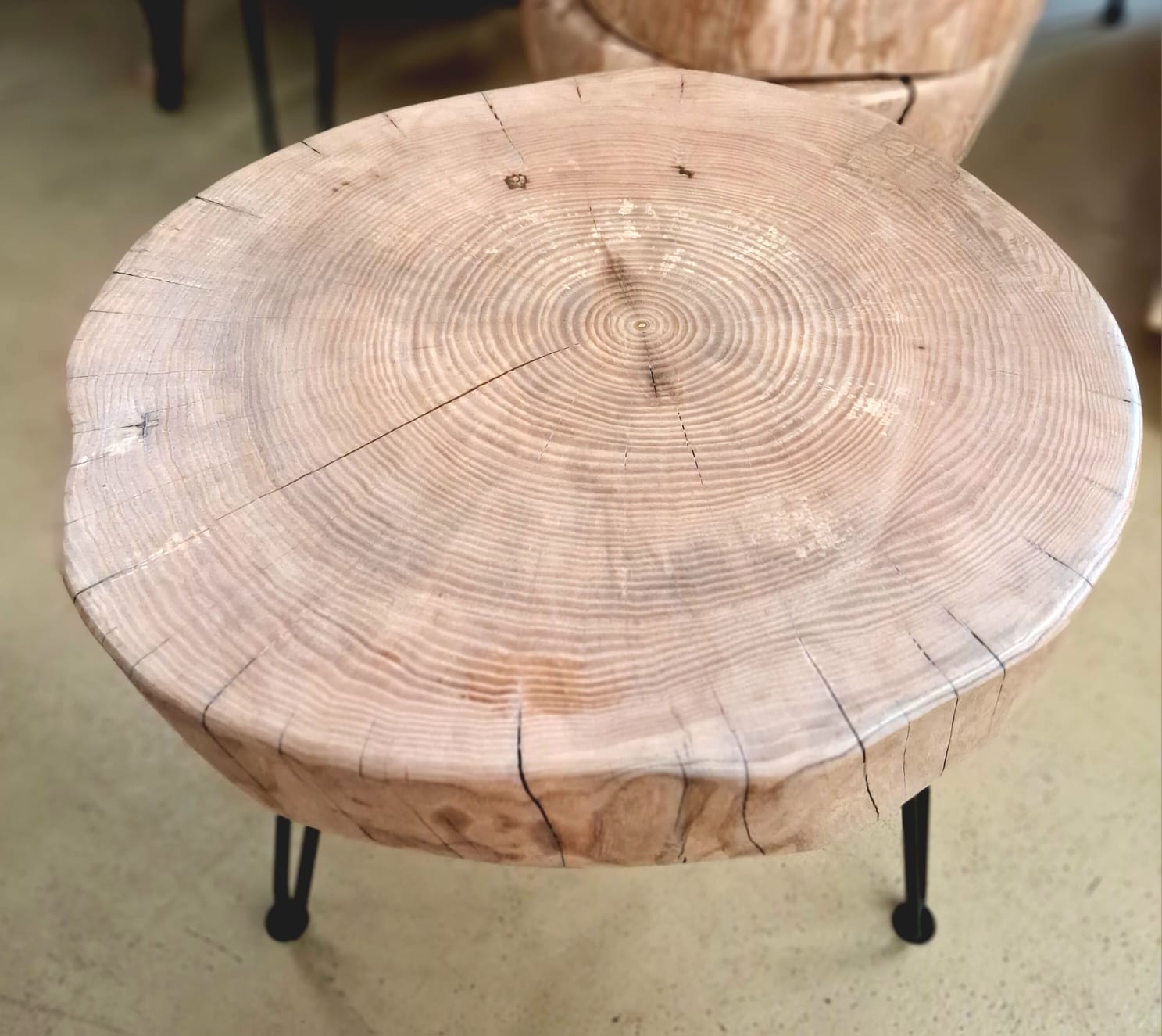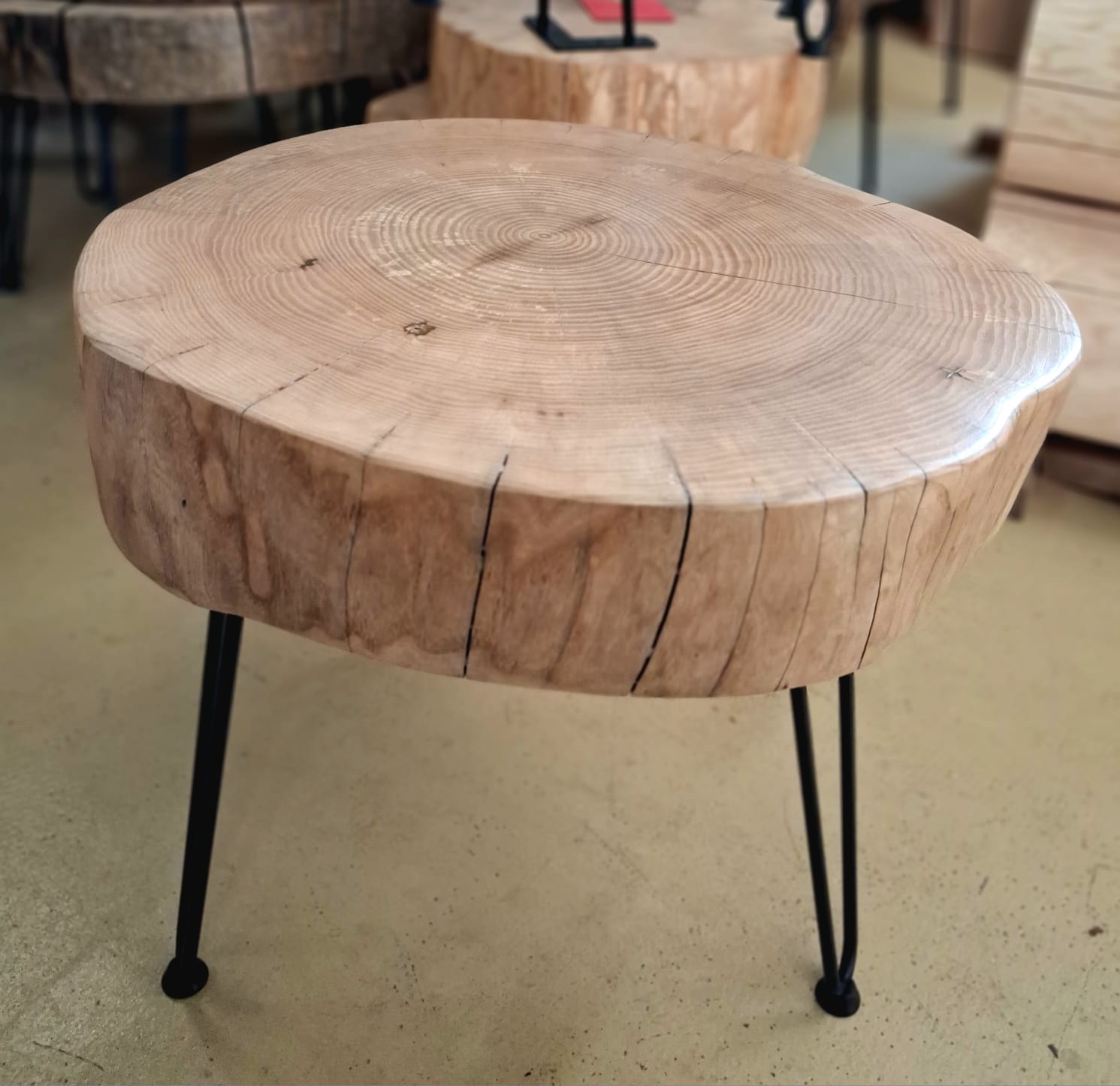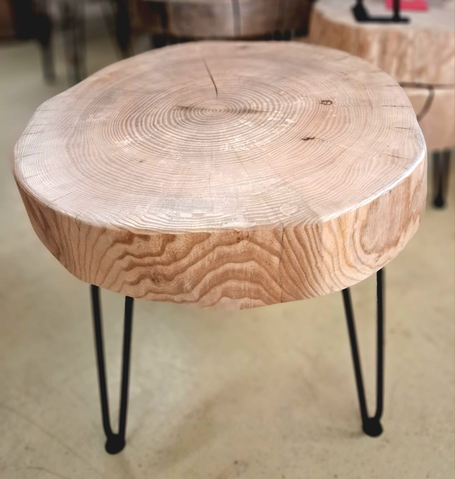 Stolek vyrobený z vybraného jasanového dřeva. Jedná se o příčný řez českým jasanem ztepilým. Jedinečný ručně broušený koláč je ponechaný v původním přírodním tvaru stromu. Dřevo je pečlivě ošetřené ekologickým ochranným nátěrem pro dlouhou životnost a zvýraznění kresby.