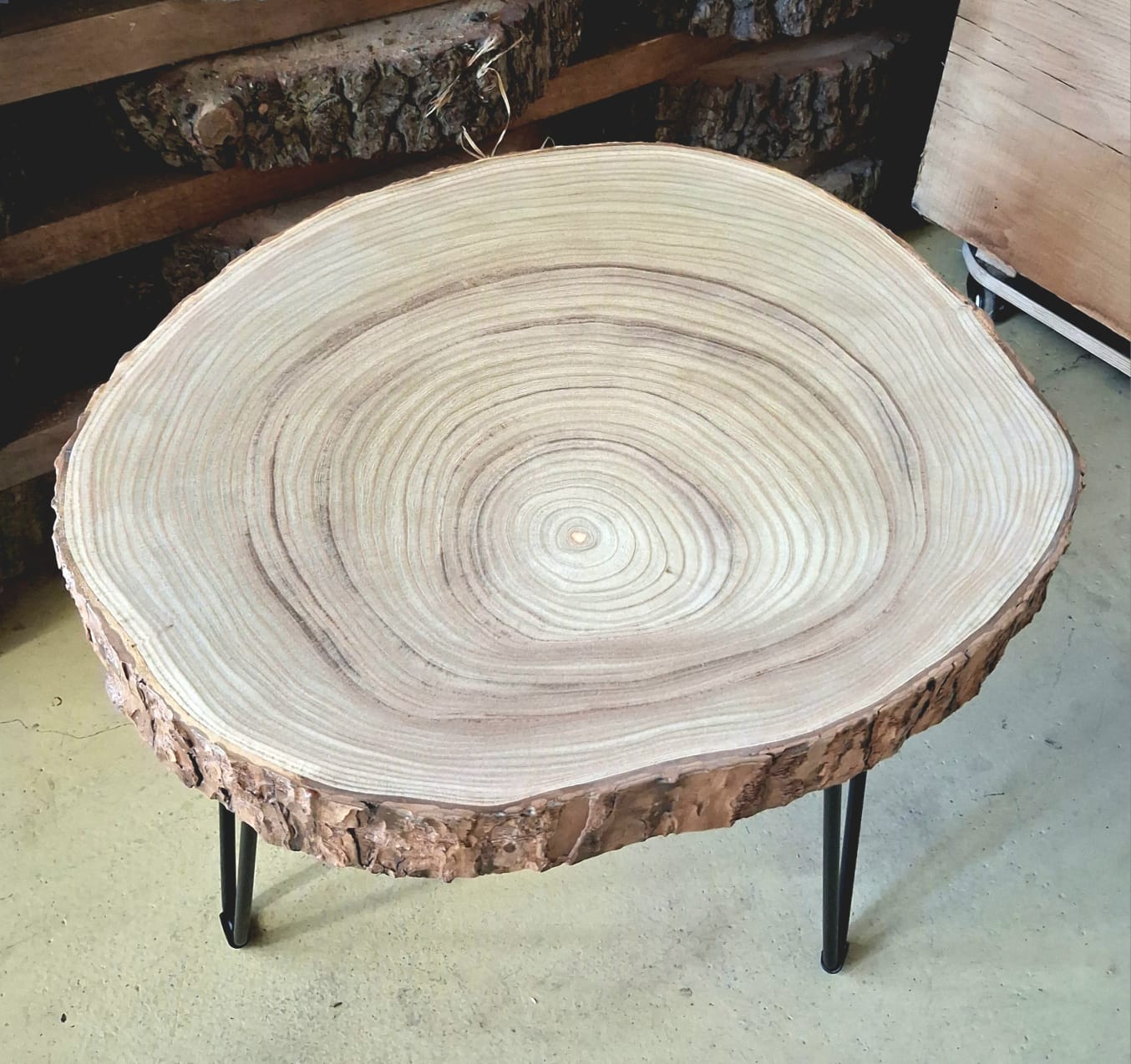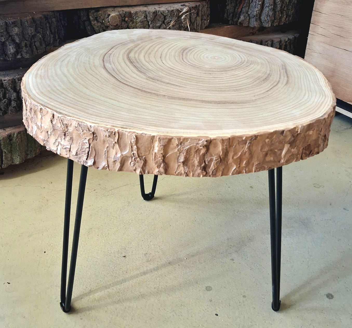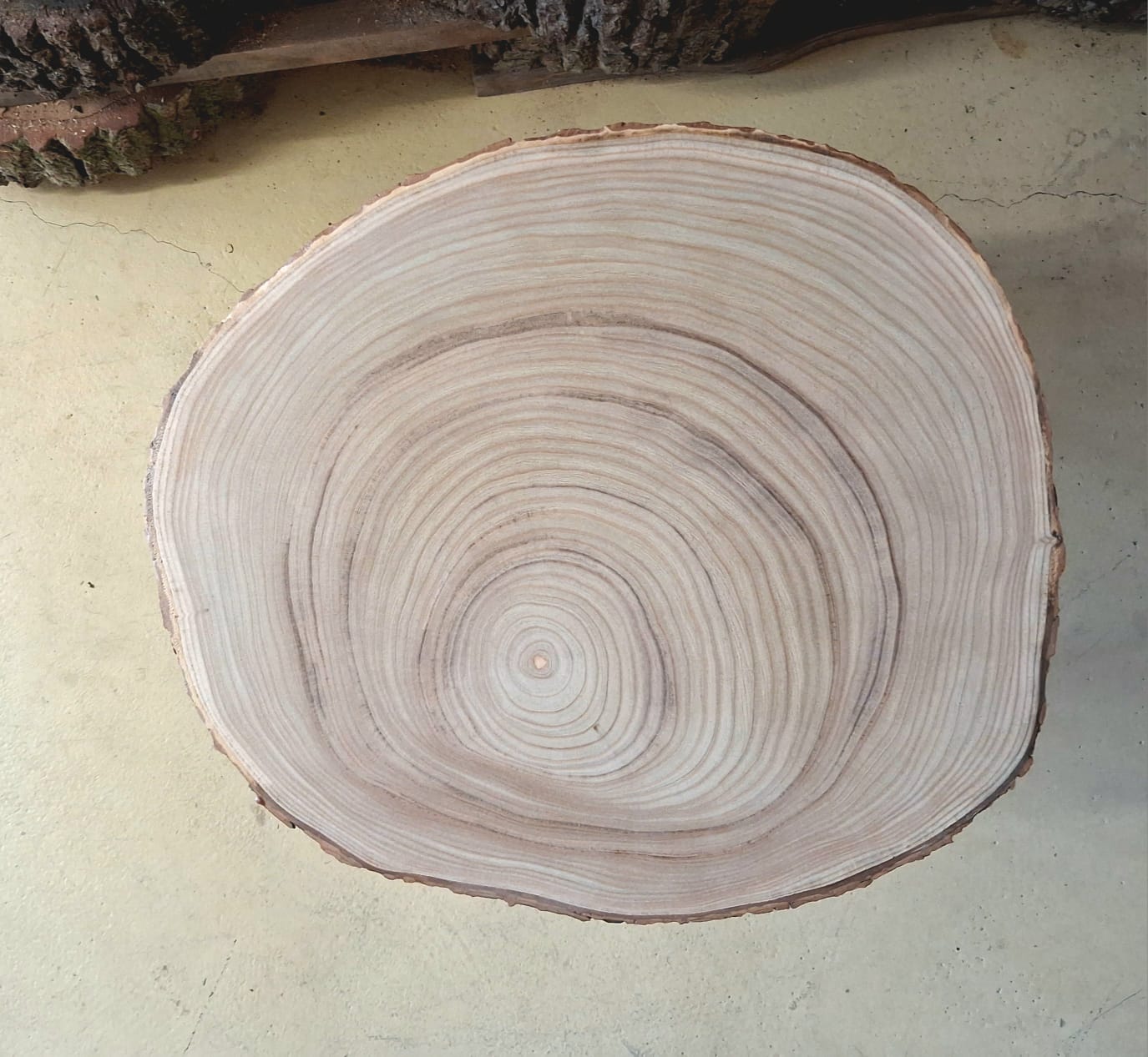 Stolek vyrobený z výjimečného katalpového dřeva. Jedná se o příčný řez katalpou trubačovitou. Ručně broušený koláč je ponechaný v originálním tvaru původního stromu včetně pečlivě zafixované kůry. Dřevo katalpy má netradiční hypnotickou kresbu a je v Evropě naprosto unikátní. V ČR lze katalpu nalézt pouze v parcích. Domovem této dřeviny je především Hawai, kde se její dřevo používá na stavbu lodí.