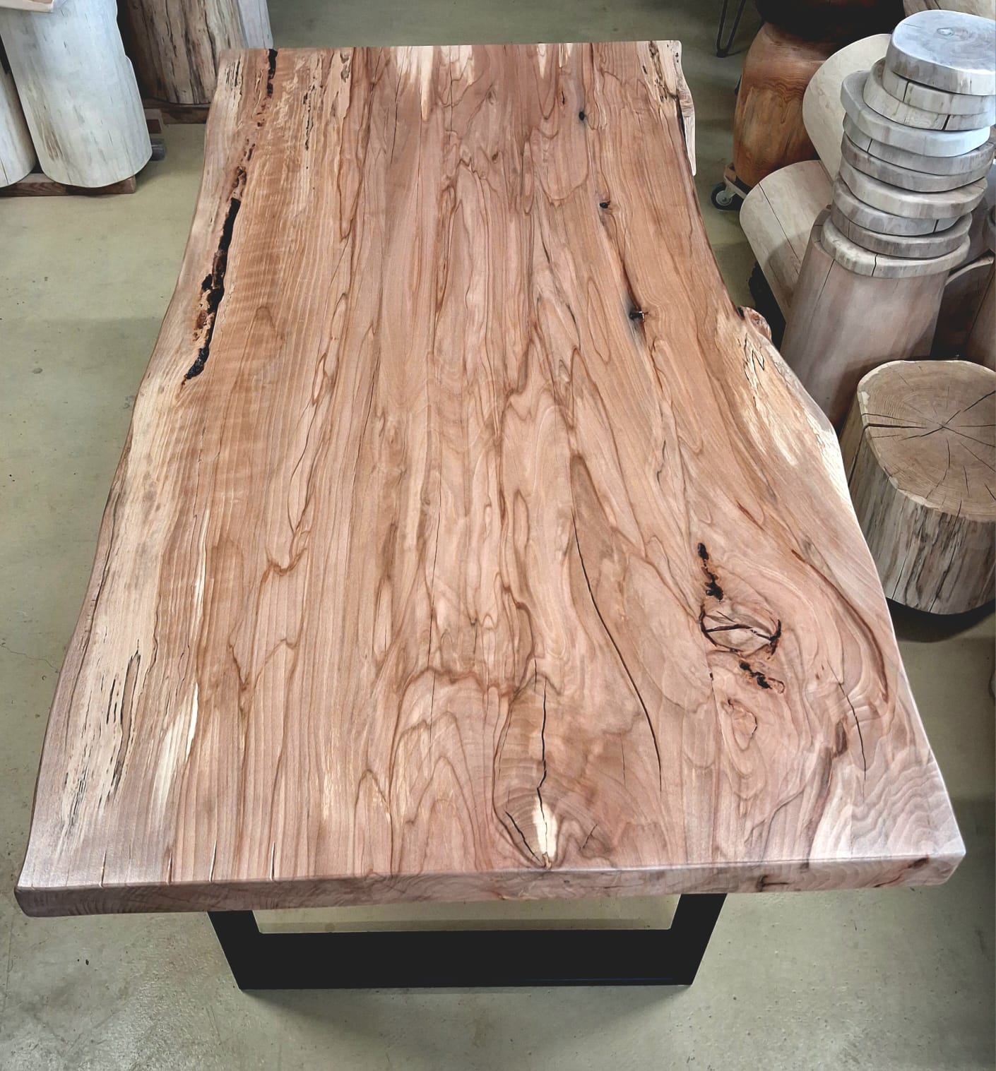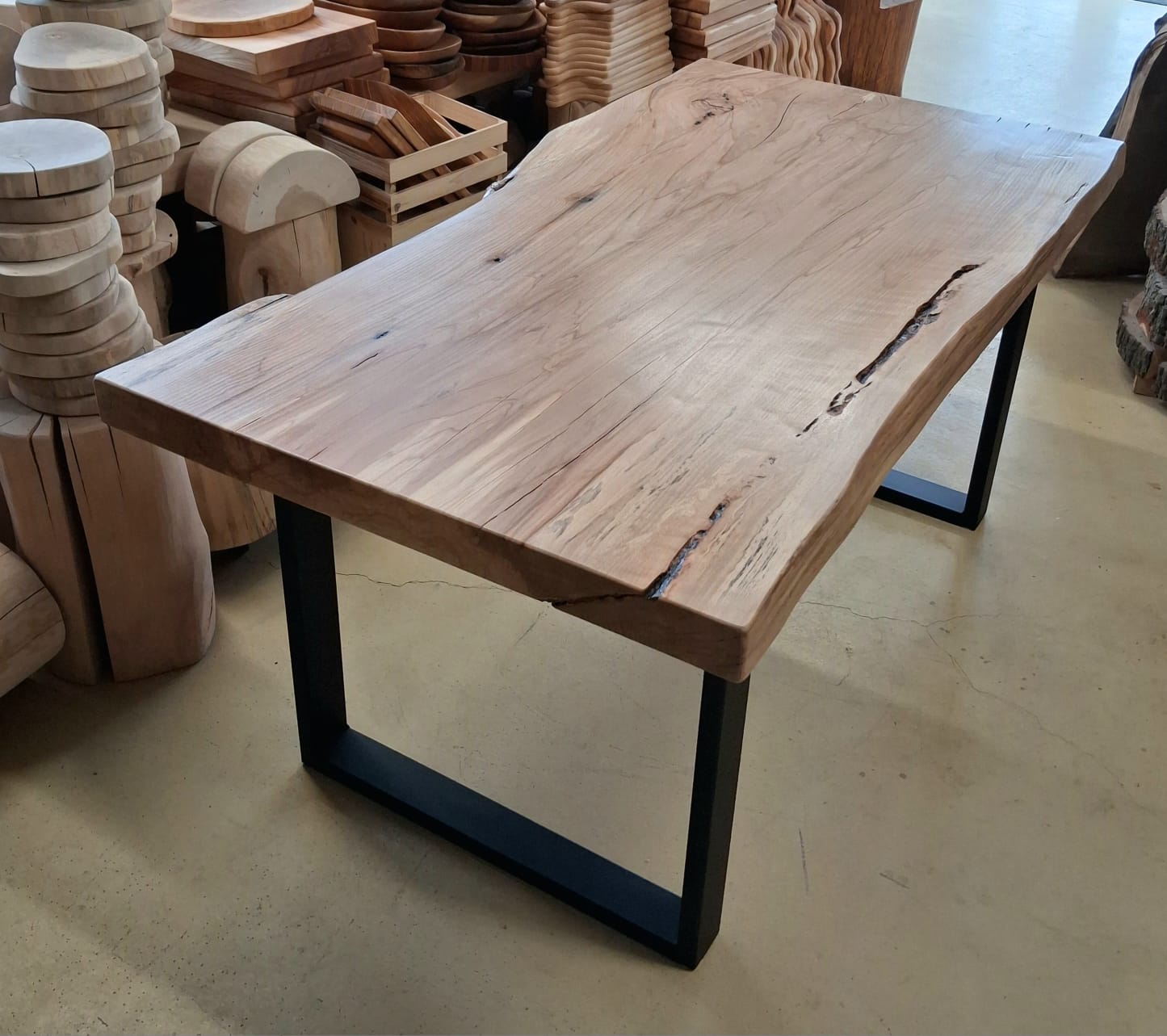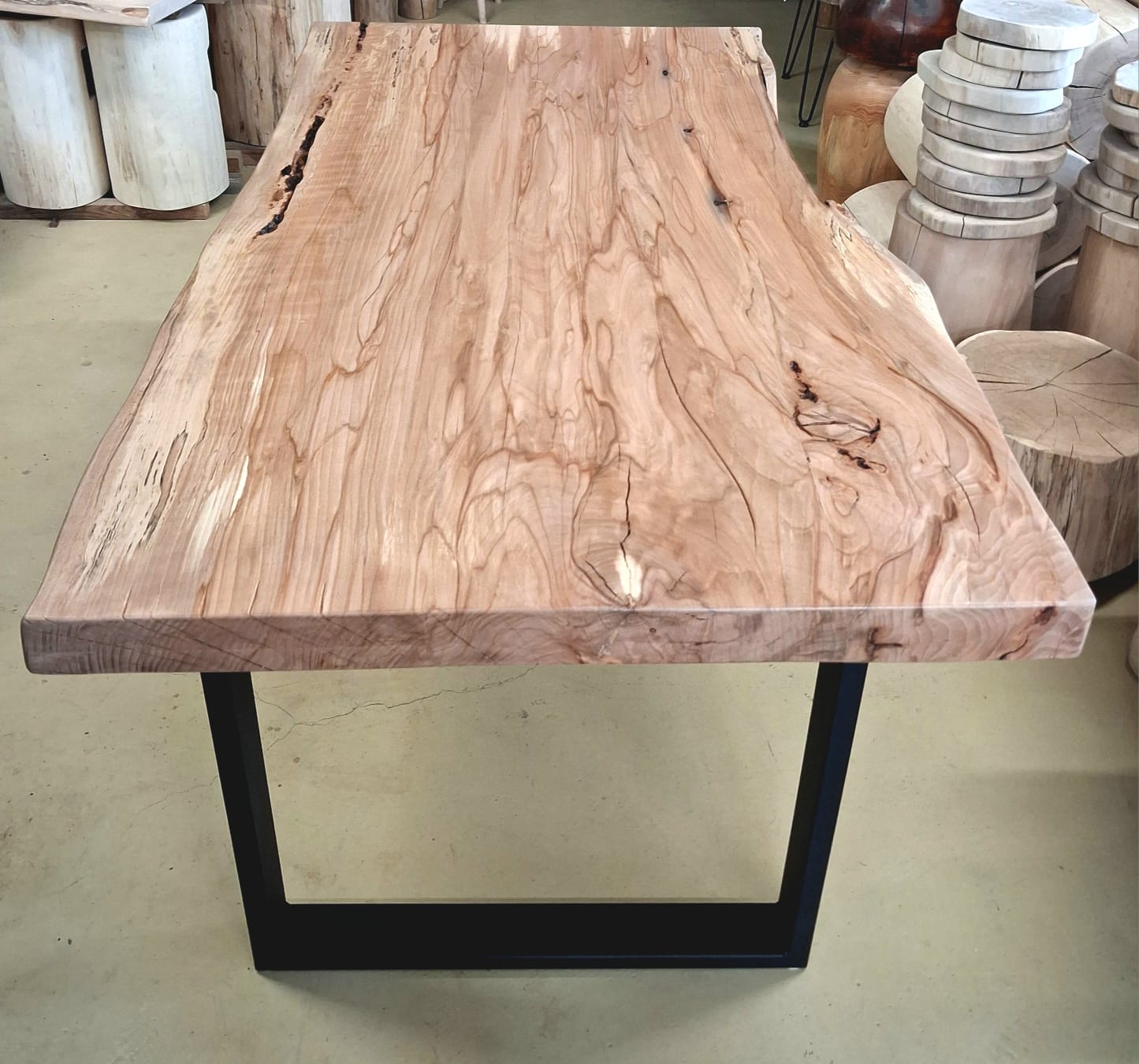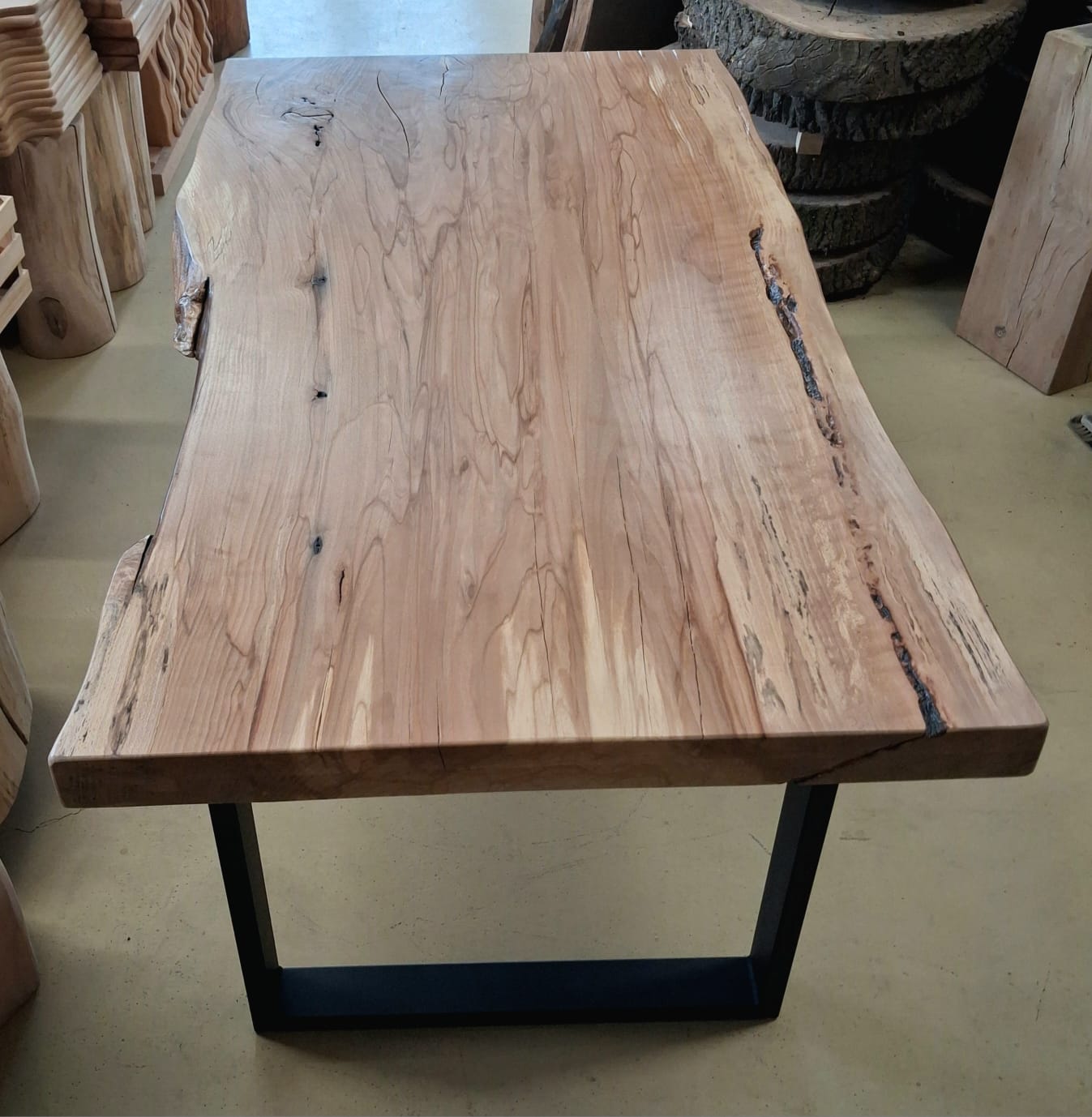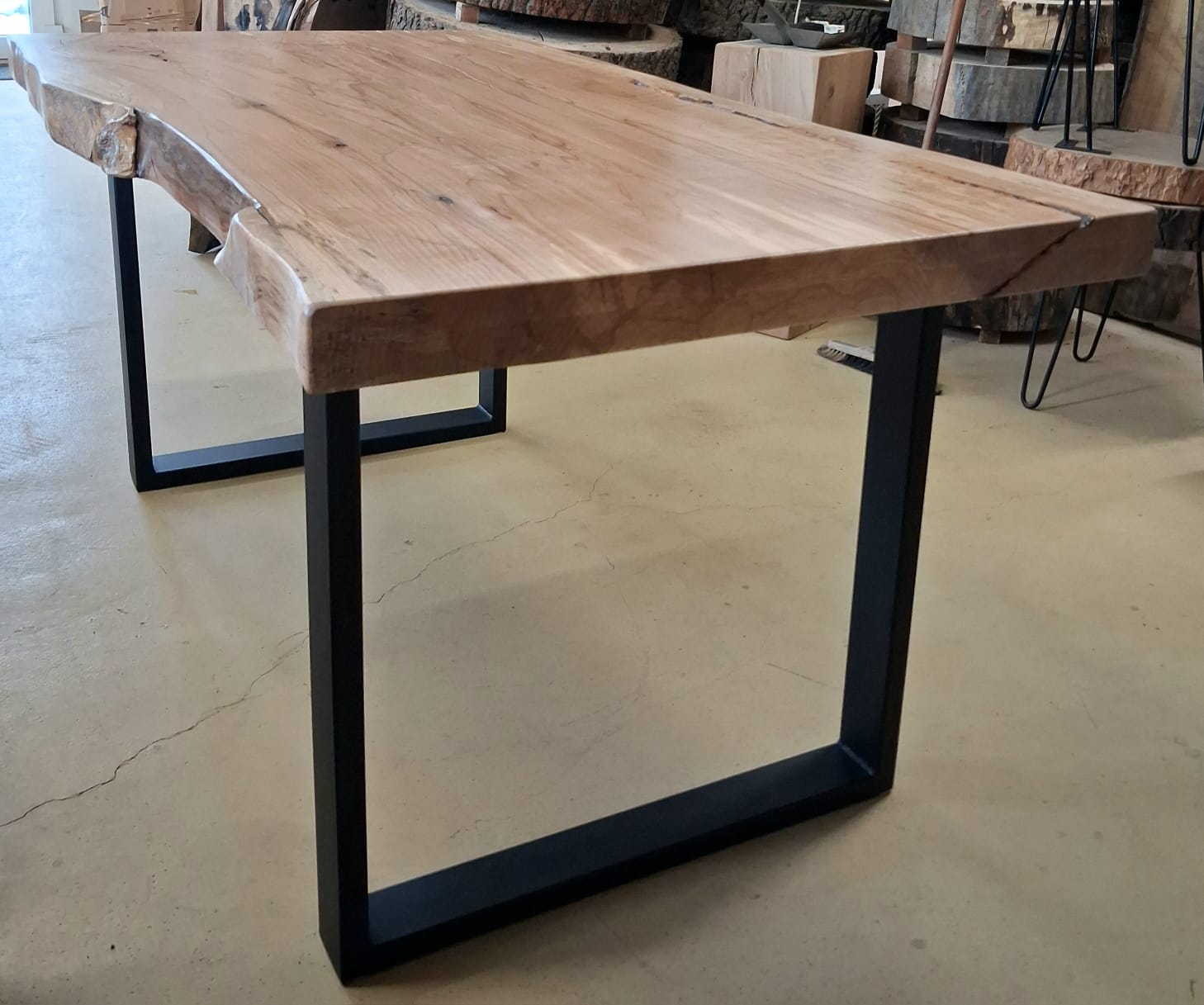 Stůl pro milovníky tvrdého bukového dřeva s deskou vyrobenou ze tří kusů. Netradiční středová buková fošna s nádhernou kresbou a přírodními hranami je umístěna na masivních lichoběžníkových podnožích. Tyto lety prověřené masivní podnože od místního kováře mají komaxitovou úpravu a jsou velmi odolné a mimořádně stabilní. Buková fošna je ošetřena "pochozím" matným nátěrem, který rovněž poskytuje stolu mimořádnou odolnost.